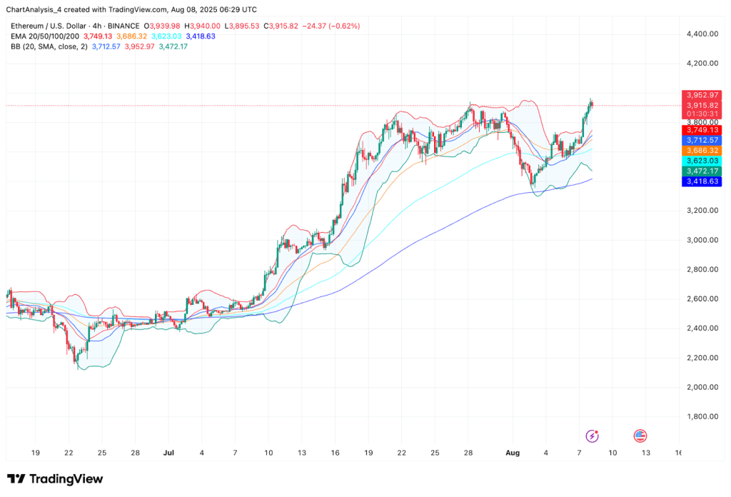 9 Ağustos’ta Ethereum (ETH), etkileyici bir yükseliş sergileyerek 4.100 $ seviyesini kırdı. Bu hareket, kripto piyasasında haftanın en dikkat çeken gelişmelerinden biri oldu.