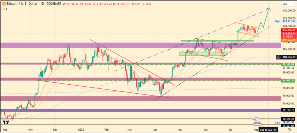 - Daha aşağıda $115.500 (orta vadeli yükseliş trend çizgisi)